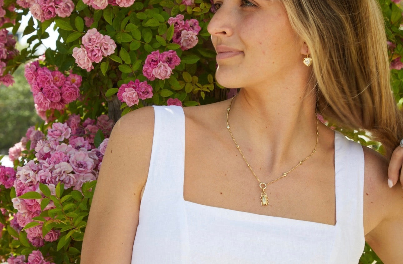 To keep your bugs shining their brightest, please do not shower, swim, or sleep in your Goldbugs, and keep them away from sunscreens, lotions, and perfumes. If you need to clean your piece, simply rinse with warm water and a gentle soap. Like our live bug friends- sadly, costume jewelry doesn’t live forever. Please visit our care page for more details!
